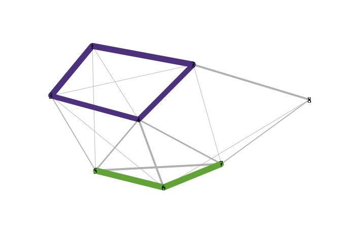 #> [1] "cohesion_matrix" "matrix" "array"The overall structure of the data can be observed via the networks obtained from cohesion (referred to here as “community graphs”). The community graph is a symmetric, weighted graph which is obtained from symmetrizing the cohesion matrix (using \(\min\{C_{x, w}, C_{w, x}\}\)) and removing self-loops. The “community cluster graph” is the subgraph consisting of only the edges for which mutual cohesion greater than the above threshold.
