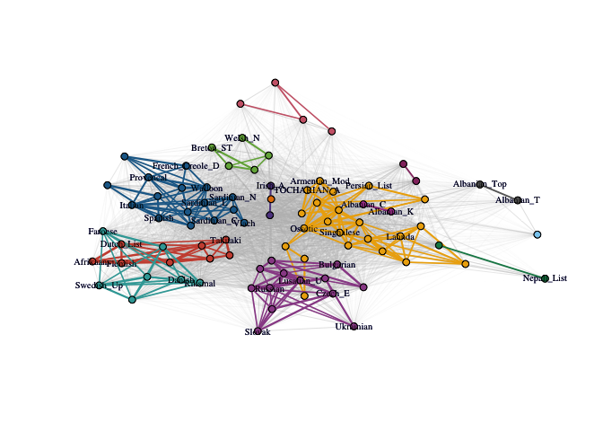 One could alternatively use the wrapper function: \(\texttt{pald(cognate_dist, emph_strong = 3, edge_width_factor = 30, vertex.label = lang_lab_subset, vertex.label.cex = .65, vertex.size = 3)}\). It will return a list containing: the cohesion matrix, local depths, (community) clusters, the threshold for identifying strong ties, the thresholded and symmetrized cohesion matrix, the community graph whose edges are weighted by mutual cohesion, the weighted graph of strong ties, and the layout provided by the FR network drawing algorithm applied to the community graph.
