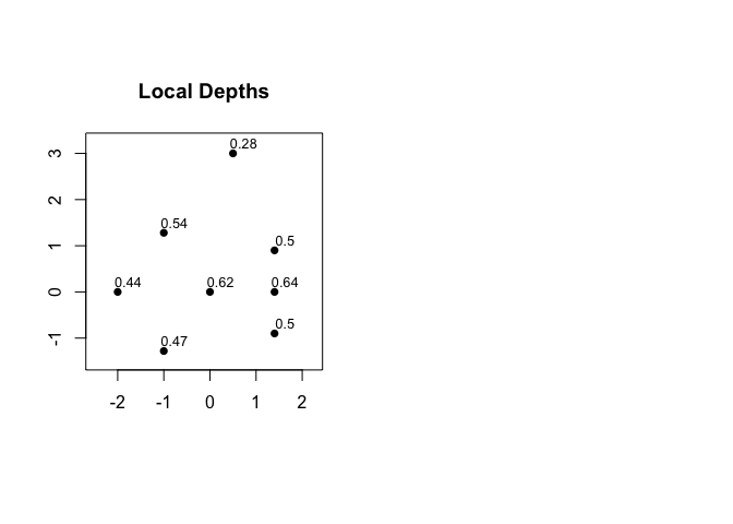 Local depth is a probability which describes the support for each point in data-determined local foci. Cohesion is obtained by partitioning local depth, and thus the values of local depth can be computed as the row sums of the cohesion matrix. See also Figure 2(b), above. The average of the values of local depth is always equal to 1/2.