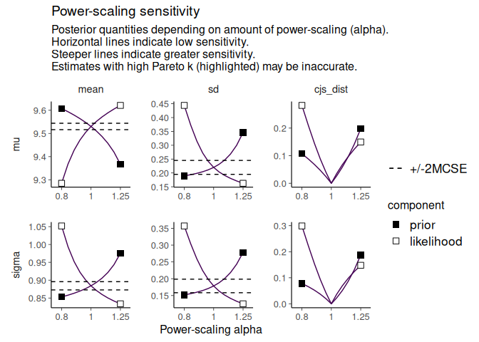 Power-scaling sensitivity analysis and priorsense are described in Kallioinen et al. (2023).