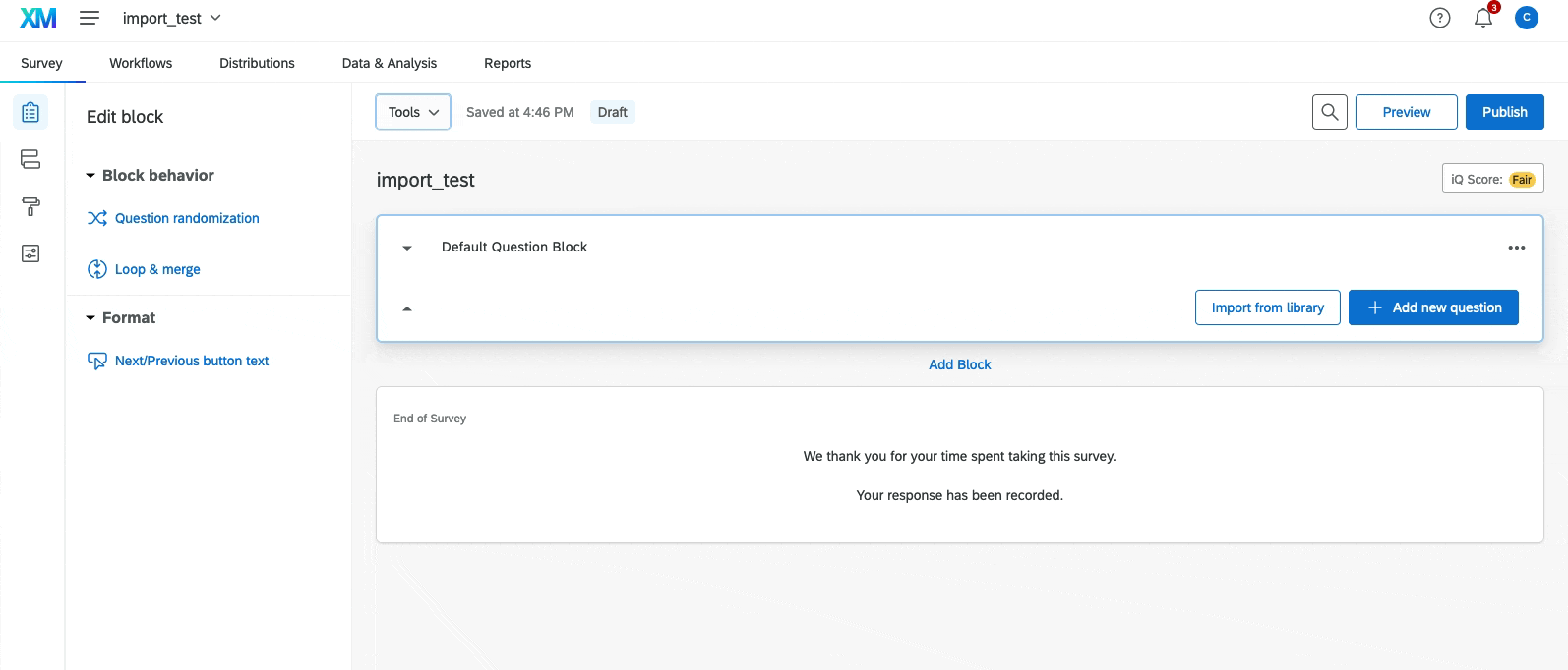 After we’ve generated the file in the appropriate format, we can import to Qualtrics. First we go to the survey in question, here named “import_test.” We then click on tools and select the “Import/Export” > “Import survey.”