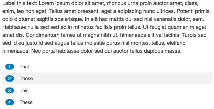 The prompt argument is optional and gives the user the ability to add a prompt before the text for labelling. The second argument is the text to be labelled. Here, we are specifying our dummy lipsum_text data and, specifically, the column lipsum_text$text. The response_type parameter has several options, including “scale” for an integer scale. For this, we then need to specify an upper and lower bound with the nlow and nhigh parameters. The other options here are “yesno” for a binary yes or no response, and “options,” which then requires the additional options parameter.