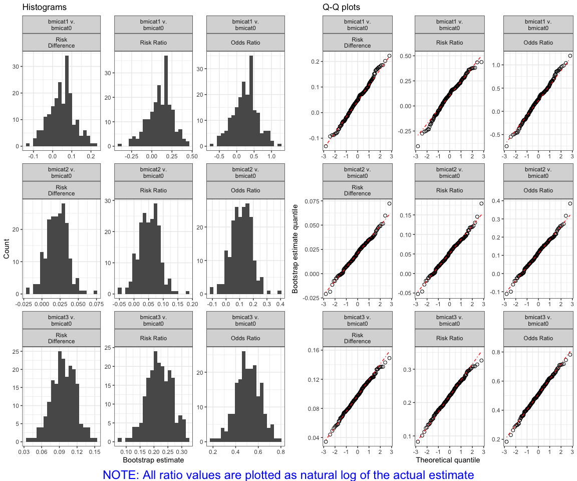 bmi.results <- gComp(data = cvdd, Y = "cvd_dth", X = "bmicat", Z = c("AGE", "SEX", "DIABETES", "CURSMOKE", "PREVHYP"), outcome.type = "binary", R = 200)