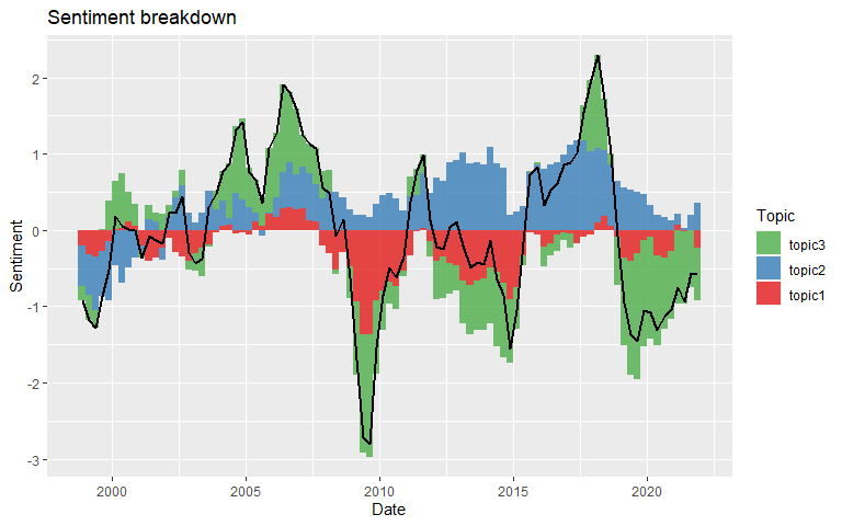 plot_sentiment_breakdown(lda, period = "quarter", rolling_window = 3)