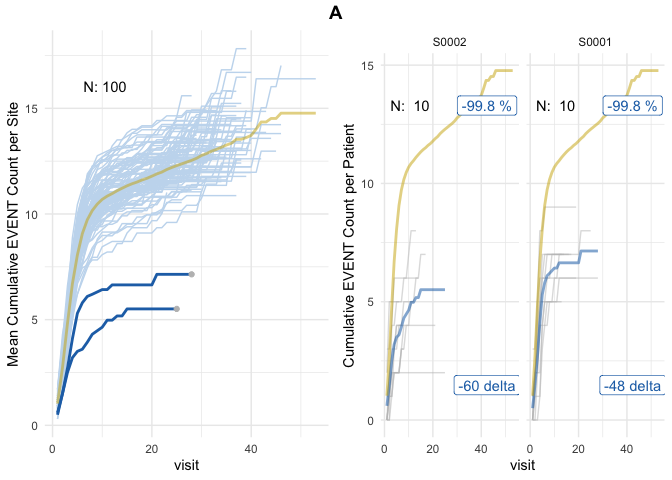 Left panel shows mean cumulative event reporting per site (blue lines) against mean cumulative event reporting of the entire study (golden line). Sites with either high under-reporting (negative probabilities) or high over-reporting (positive probabilities) are marked by grey dots and plotted in additional panels on the right. N denotes the number of sites. Right panel shows individual sites with total patient cumulative counts as grey lines. N denotes the number of patients, the percentage the under- and over-reporting probability and delta denotes the difference compared to the expected number of events.
