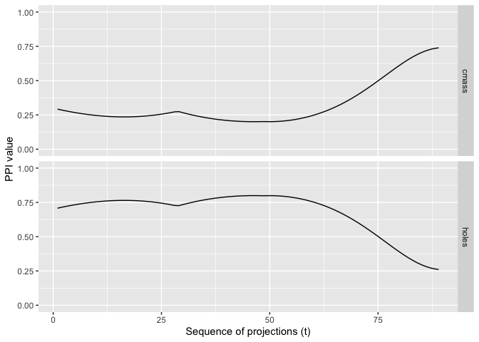 To evaluate the index behaviour on a known input distribution we can trace its value when interpolating a tour path, for example moving from nuisance and structured projection.
