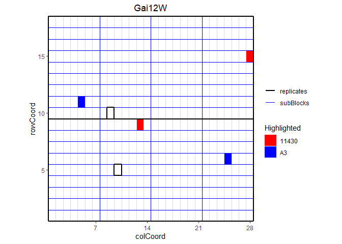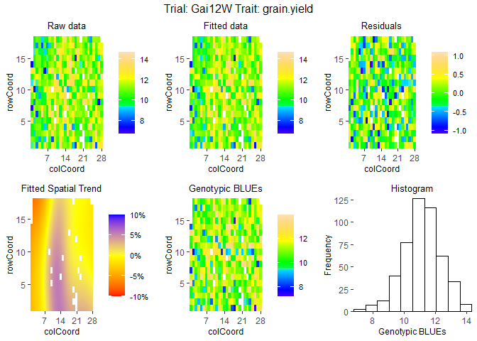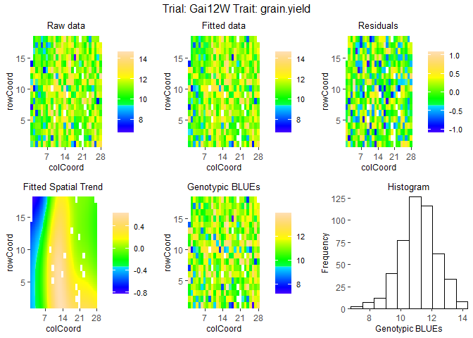 #> Using SpATS for fitting models.## Spatial plot for the model with genotype fitted as fixed effect.