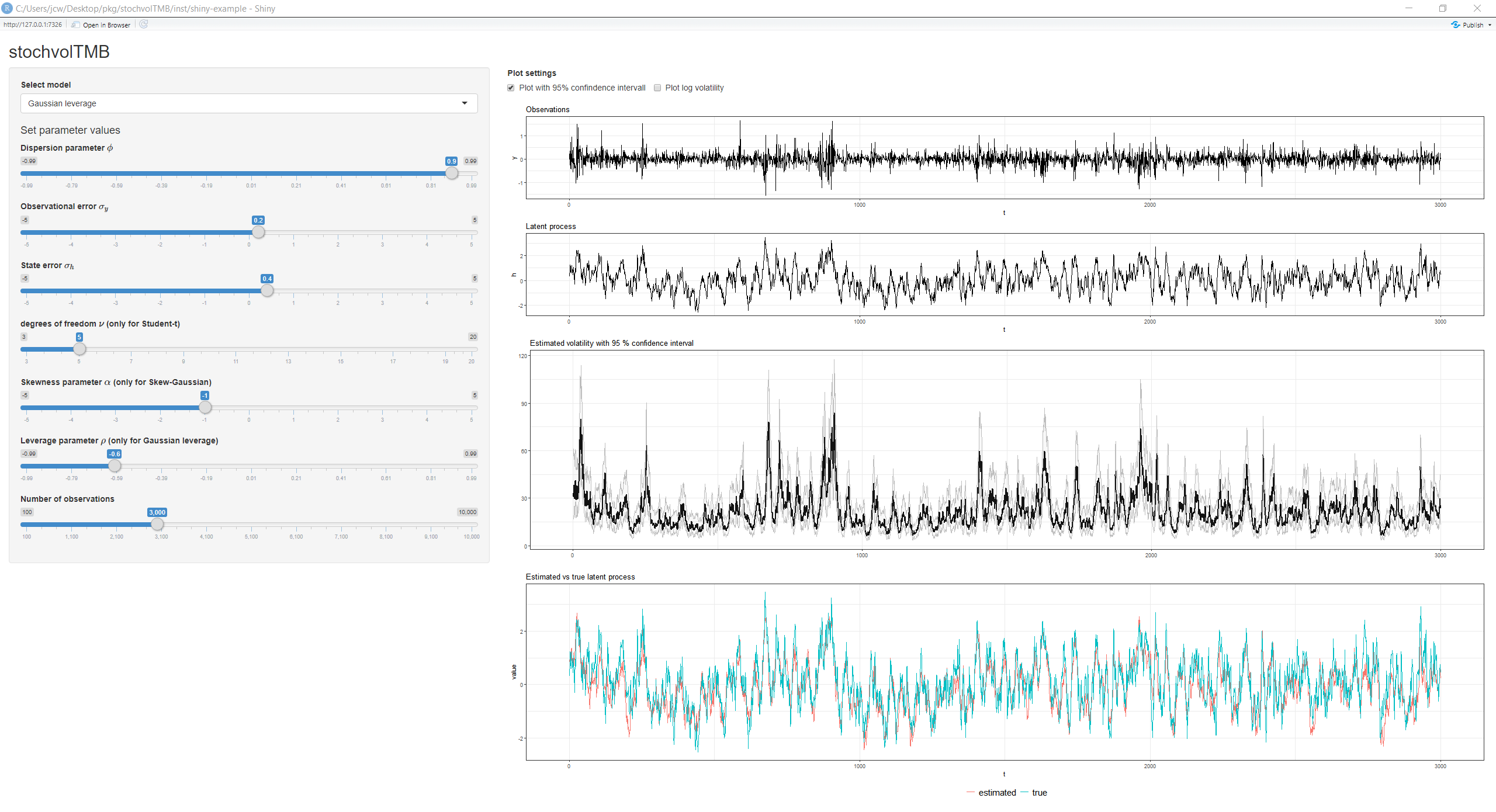 remotes::install_github("JensWahl/stochvolTMB", dependencies = TRUE, build_vignettes = TRUE)The main function for estimating parameters is