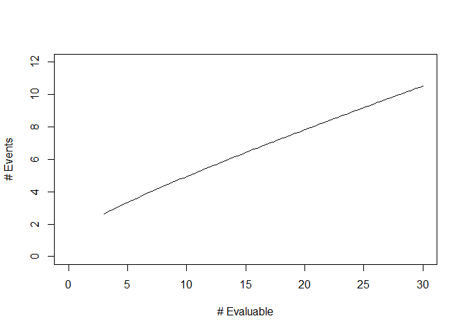 #> [1] "rule.bin"The function call uses the Bayesian beta-binomial model approach proposed by Geller et al. 2003 to construct the stopping boundaries and displays the boundaries for the first few patients. A weakly informative Beta(0.6,2.4) is specified for the toxicity probability. The `bb_rule$Rule’ element of the output displays the number evaluable and stopping criteria for all analyses; other elements contain the design parameters and boundary parameter for the stopping rule. For this rule, rejection is impossible with 1 or 2 evaluable patients because the corresponding boundary values exceeds these numbers.