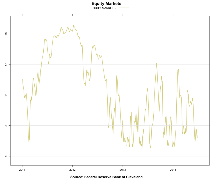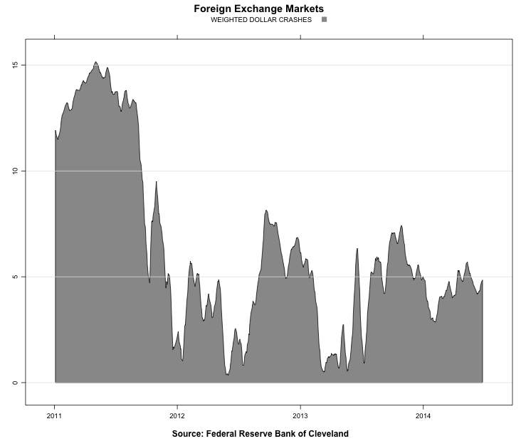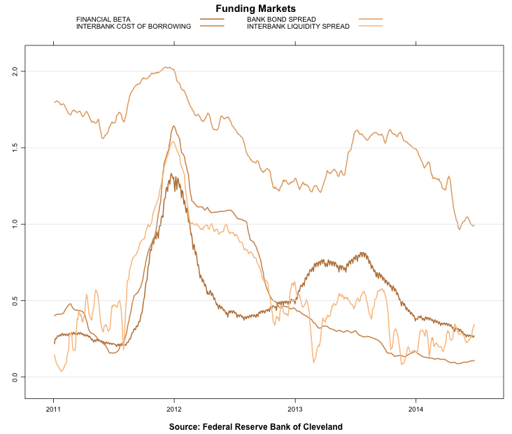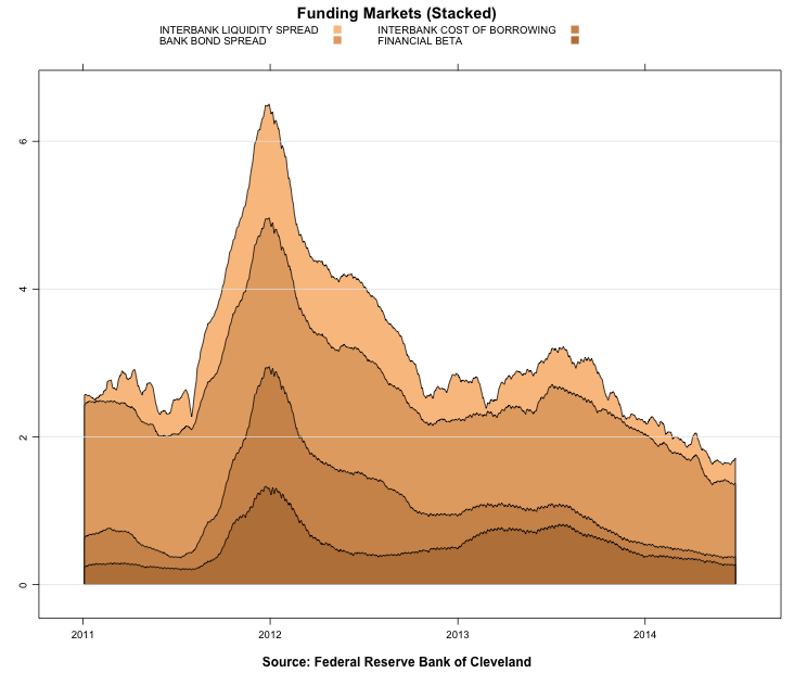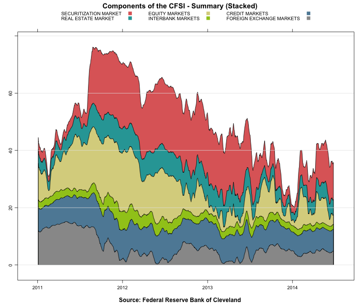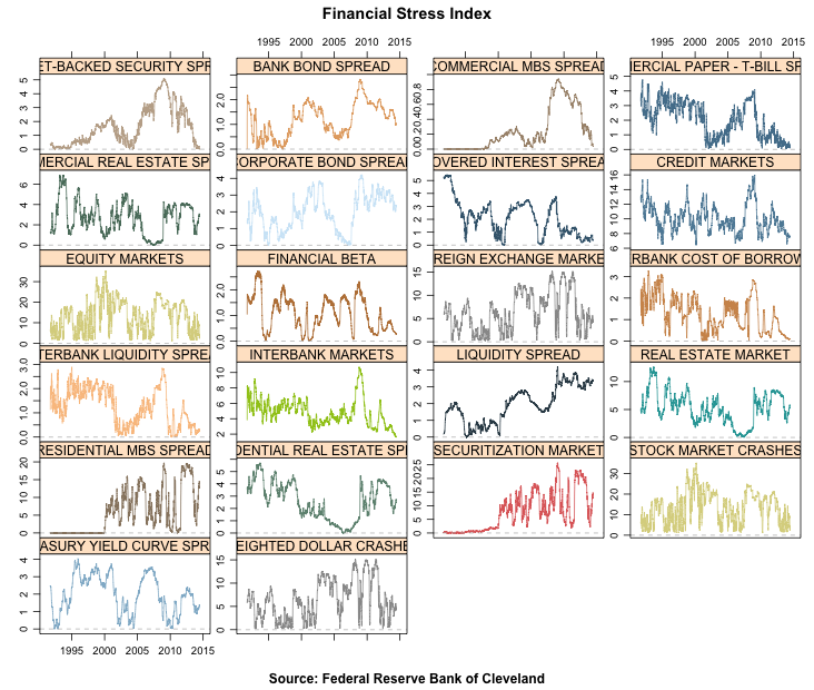 The R package stressr provides convenient access to the financial stress index and components data provided by the Federal Reserve Bank of Cleveland. The package provides data download functions and some representative plots along the same categories as provided by the bank. See the FRB’s terms of use regarding these data.