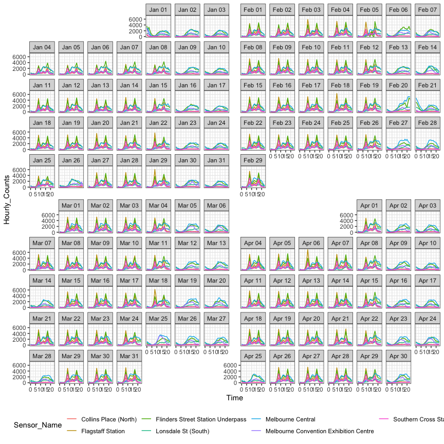 The fully-fledged faceting calendar facet_calendar() unlocks day-to-day stories.