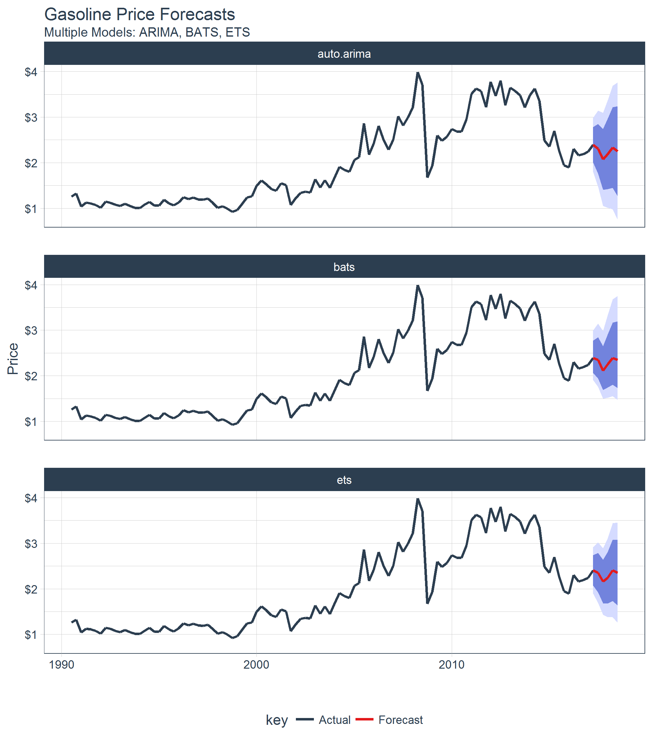 A common goal in forecasting is to compare different forecast models against each other. sweep helps in this area as well.