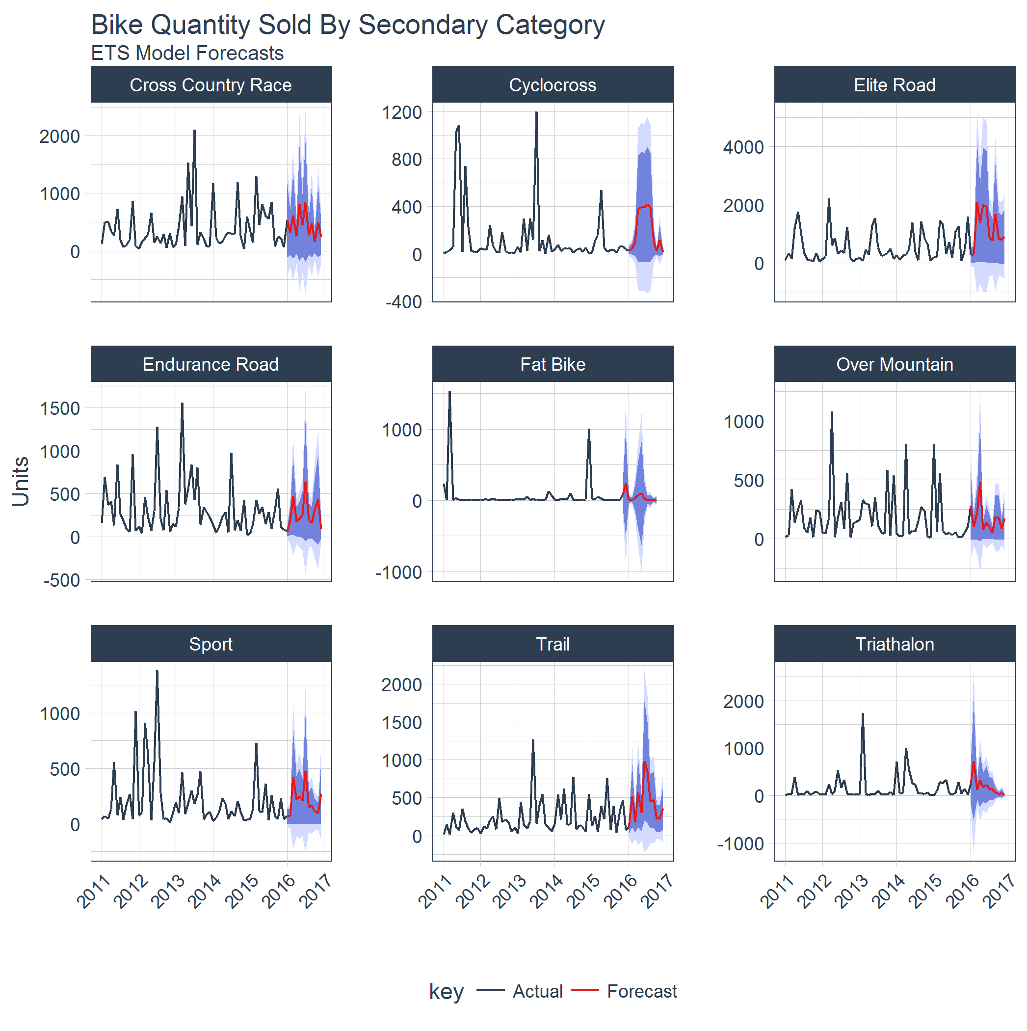 sweep enables converting a forecast object to tibble. The result is ability to use dplyr, tidyr, and ggplot natively to manipulate, analyze and visualize forecasts.