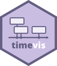 If you need to perform any actions on the timeline object that are not supported by the {timevis} API, you may be able to do so by manipulating the timeline’s JavaScript object directly. The timeline object is available via document.getElementById("id").widget.timeline (replace id with the timeline’s id).