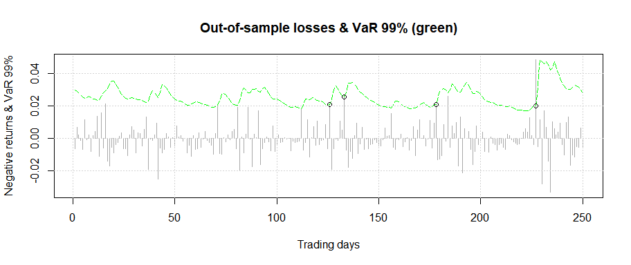 Plotting the out-of-sample loss series, VaR.v & breaches: