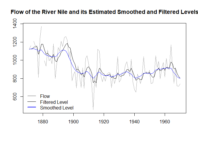In this illustrative example, we fit the local level model to the Nile dataset and compute the associated smoothed and filtered values.