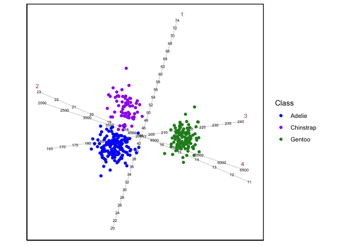When \(p < n\), then the CVA-GSVD biplot will result to the standard CVA biplot. Here is an example using the penguins data: