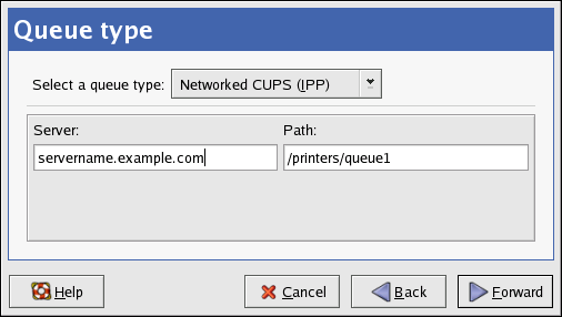 After clicking Forward, Figure 36-5 appears. Select Networked CUPS (IPP) from the Select a queue type menu.