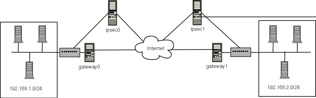 For example, suppose LAN A (lana.example.com) and LAN B (lanb.example.com) want to connect to each other through an IPsec tunnel. The network address for LAN A is in the 192.168.1.0/24 range, while LAN B uses the 192.168.2.0/24 range. The gateway IP address is 192.168.1.254 for LAN A and 192.168.2.254 for LAN B. The IPSEC routers are separate from each LAN gateway and uses two network devices: eth0 is assigned an externally-accessible static IP address which accesses the Internet, while eth1 acts as a routing point to process and transmit LAN packets from one network node to the remote network nodes.