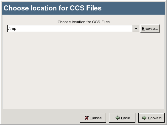 The next screen prompts you to type or browse for a directory that stores the GFS cluster configuration files created by using the GFS Setup Druid. By default, the /tmp/ directory stores the three configuration files: cluster.ccs, nodes.ccs, and fence.ccs. When a directory is chosen, click Forward to continue.