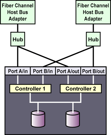 A Fibre Channel hub or switch is also required with a dual-controller RAID array with two host ports on each controller. This configuration is shown in Figure 2-9. Additional cluster members may be connected to either Fibre Channel hub or switch shown in the diagram. Some RAID arrays include a built-in hub so that each host port is already connected to each of the internal RAID controllers. In this case, an additional external hub or switch may not be needed.