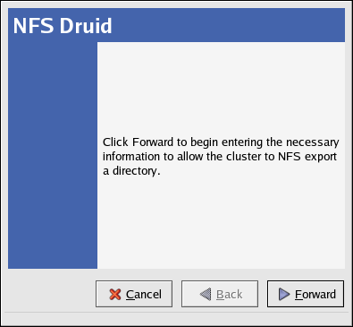 Start the NFS Druid by choosing Add Exports => NFS... and click Forward to continue.