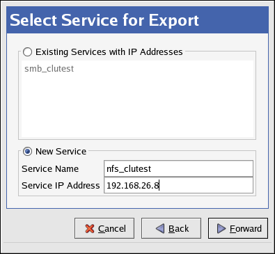 If an existing service contains the device and mountpoint configuration for the directory you want to NFS export, then select that existing service. Otherwise, enter a new Service Name and Service IP Address for the NFS export directory.