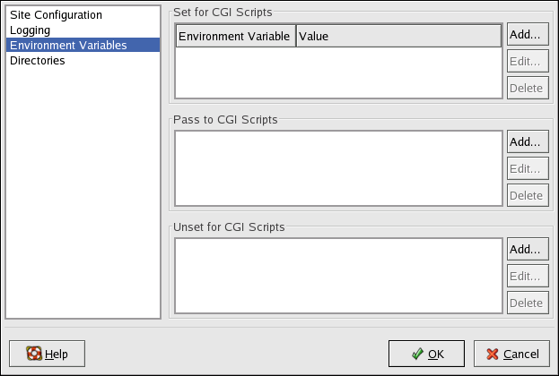 Use the Pass to CGI Scripts section to pass the value of an environment variable when the server was first started to CGI scripts. To see this environment variable, type the command env at a shell prompt. Click the Add button inside the Pass to CGI Scripts section and enter the name of the environment variable in the resulting dialog box. Click OK to add it to the list. The Pass to CGI Scripts section configures the PassEnv directive.