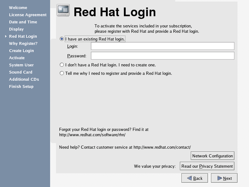 You must register your system with Red Hat Network to continue. Red Hat Network provides automatic updates of your Red Hat Enterprise Linux system, including security updates. If you have already registered with Red Hat Network, enter your account information in the appropriate field. If you have never registered, choose I don't have a Red Hat login. I need to create one.. Click Next — if you need to create a Red Hat login, the Red Hat Update Agent launches. After you have entered your Red Hat login information, the Setup Agent continues to the next screen.
