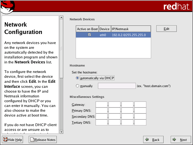 To change your network configuration after you have completed the installation, use the Network Administration Tool. Type the system-config-network command in a shell prompt to launch the Network Administration Tool. If you are not root, it prompts you for the root password to continue. |