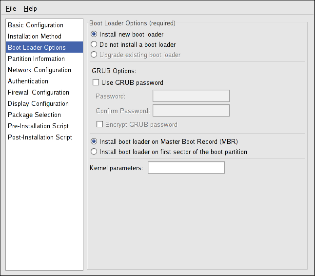 You can password protect the GRUB boot loader by configuring a GRUB password. Select Use GRUB password, and enter a password in the Password field. Type the same password in the Confirm Password text field. To save the password as an encrypted password in the file, select Encrypt GRUB password. If the encryption option is selected, when the file is saved, the plain text password that you typed are encrypted and written to the kickstart file. If type an already encrypted password, unselect to encrypt it.