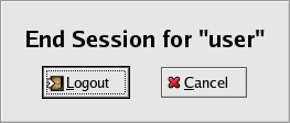 There are two ways to log out of your KDE session. From the Main Menu, select Logout User, where User is your account username. To log out from the desktop, right-click on the desktop and, from the menu, select Logout User where User is your account username. In either case click Logout and your session ends.