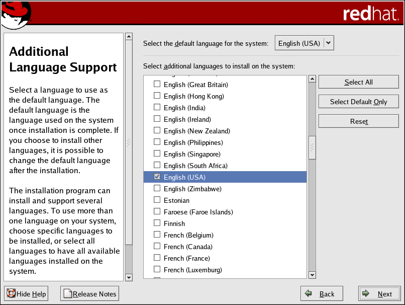 To change the language configuration after you have completed the installation, use the Language Configuration Tool. Type the system-config-language command in a shell prompt to launch the Language Configuration Tool. If you are not root, it prompts you for the root password to continue. |