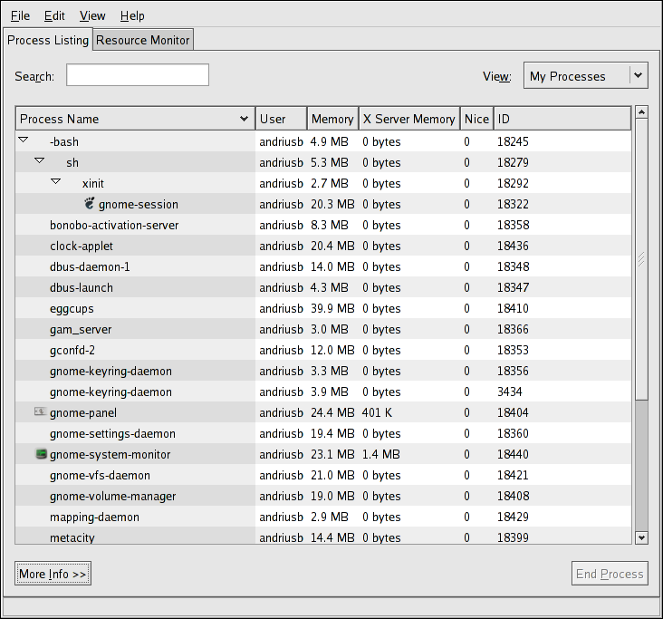 If you prefer a graphical interface for top, you can use the GNOME System Monitor. To start it from the desktop, select Applications (the main menu on the panel) => System Tools => System Monitor or type gnome-system-monitor at a shell prompt (such as an XTerm). Select the Process Listing tab.
